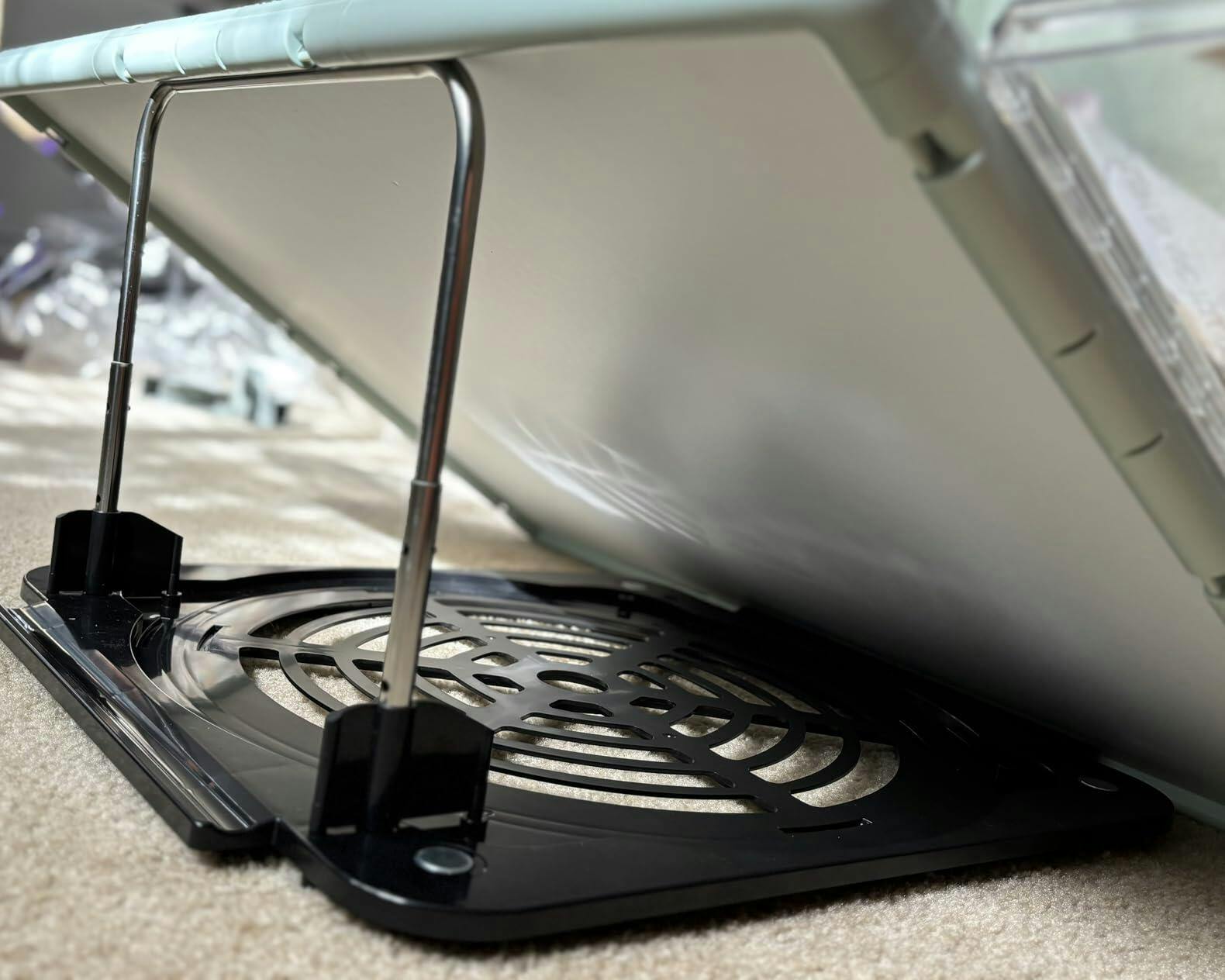 - The main puzzle table does not sit on the lip of the lazy susan, but simply rests on the metal part of the tilting device. So, if someone accidentally kicked the puzzle from behind, the table would fall off. There should be a way to secure the table to the tilting device.